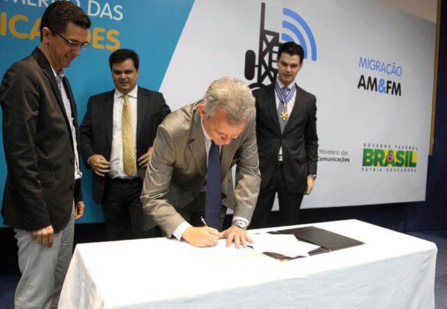 Brasília, 10/05/2016 - O ministro das Comunicações, André Figueiredo, assinou nesta terça-feira (10) o termo aditivo que autoriza a migração de 53 rádios AM (veja lista abaixo) para a faixa de FM. As emissoras estão instaladas em vários estados do País e fazem parte das rádios AM que pediram ao ministério para fazer a mudança de faixa.