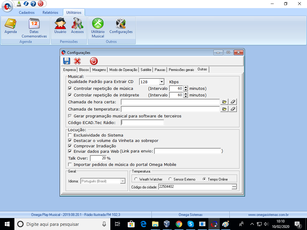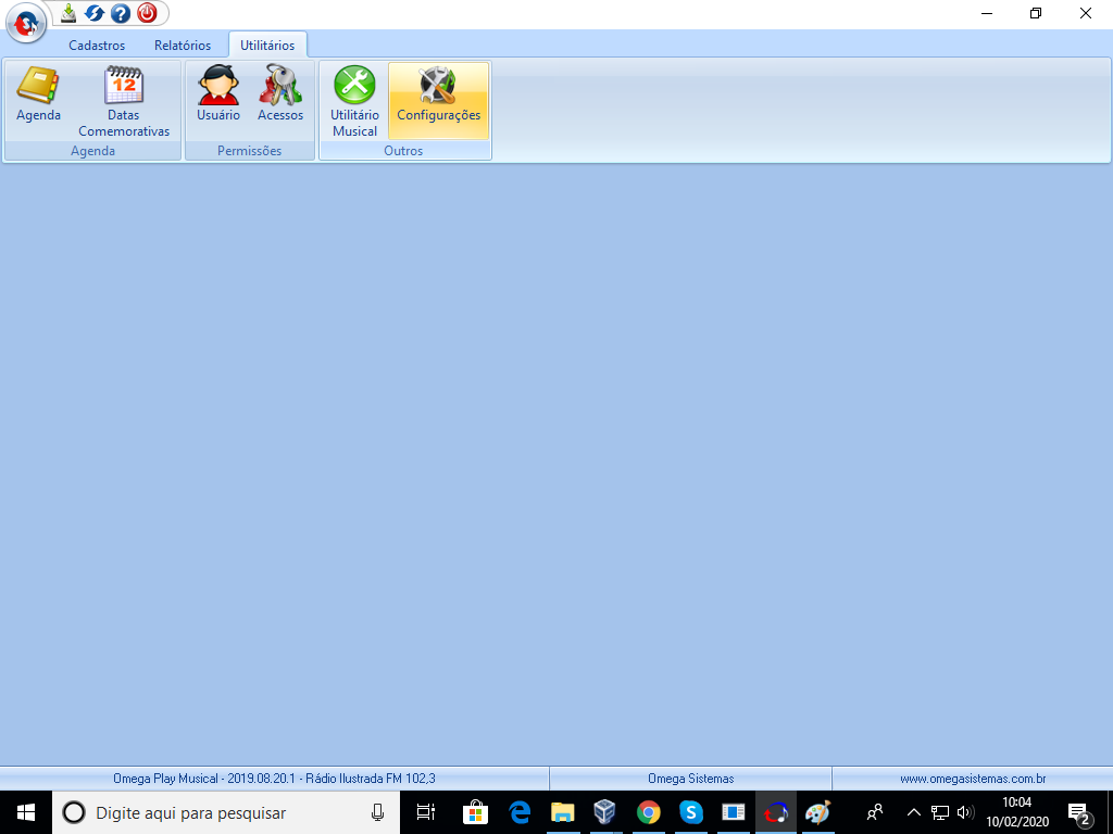 1º Passo: No Omega Play Musical, no menu Utilitários clique na opção Configurações.